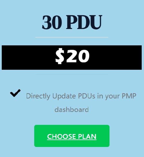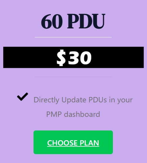 With our PMP renewal PDU bundle, you can simply get 60 PDUs. We can provide PDU bundles in 10, 30 and 60 PDUs. Once you purchase our PDU bundle, we will directly update PDUs in your PMI account, so that you will not feel any difficulties. Further, we provide PDU bundles for PMI-ACP, PMI-RMP, CAPM also.